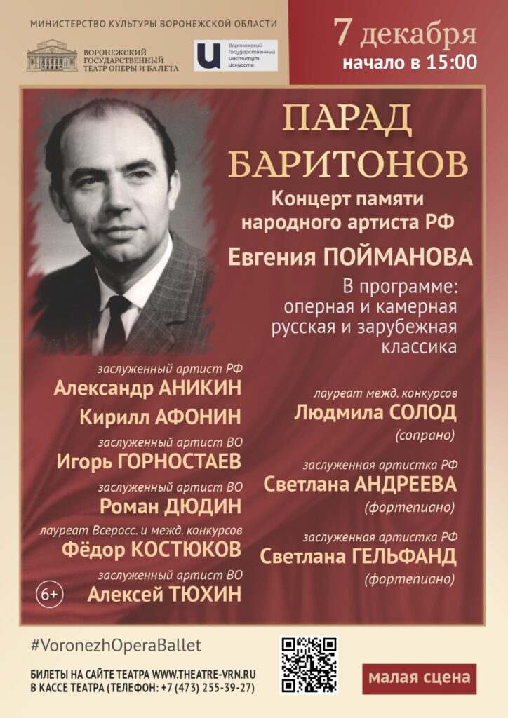 7 декабря на малой сцене Воронежского театра оперы и балета состоится концерт, посвящённый памяти Евгения Пойманова, воронежского оперного исполнителя, театрального деятеля, народного артиста России. С 1961 по 1979 годы он был ведущим солистом Воронежского театра оперы и балета, где исполнил более 40 партий в оперных спектаклях и опереттах.
