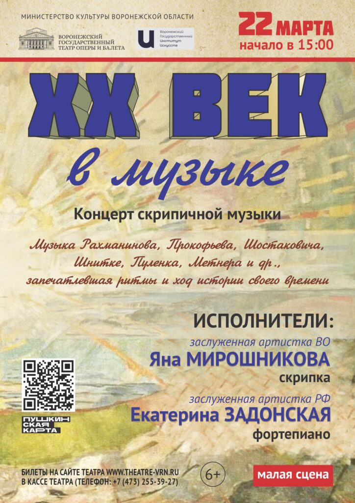 22 марта на Малой сцене театра пройдёт концерт, в котором прозвучат произведения известных композиторов XX столетия, внесших свой неоценимый вклад в развитие мирового искусства. Начало в 15 часов.
