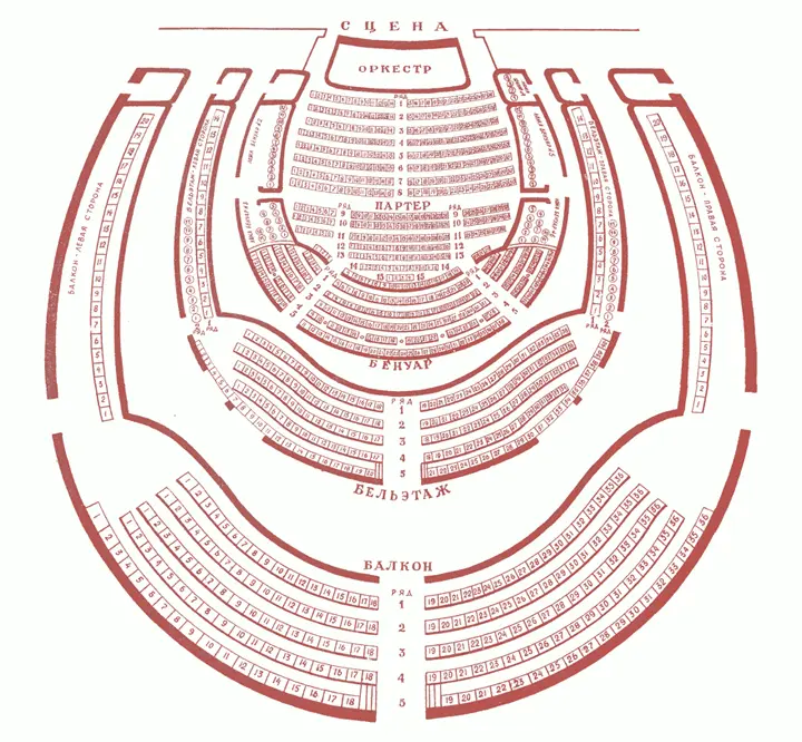 План зрительного зала Вместимость зала: 1073 места Параметры сцены площадь: 26,08×20,1 м высота от планшета до колосников: 20,8м Оркестровая яма площадь: 59,3 м ширина: 14,6 м глубина: 4,06 м Положение о продаже билетов Правила посещения театра и продажи билетов План зрительного зала План сцены Продажа билетов Абонементы Билеты для участников СВО